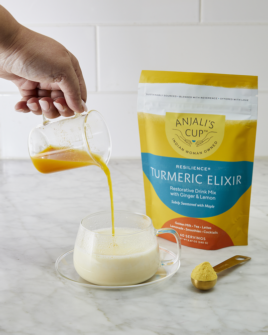 Anjali’s reverence for turmeric began in childhood, watching her mother use the golden root to treat everything from colds and upset stomachs to sore muscles, and for helping manage an autoimmune issue that Anjali developed when she was just eight years old. Decades later, when Anjali began struggling with debilitating migraines, Anjali again turned to turmeric for support. She developed her own recipe, combining turmeric’s trusted benefits with the convenience of a powder, resulting in a one-of-a-kind product that delivers on turmeric’s maximum benefits with a fresh and delicious taste that is suitable for daily consumption. When her migraines disappeared for good within two months, Anjali knew she had created something special, and Anjali’s Cup’s Resilience® Turmeric Elixir, the brand’s signature blend, was born.
