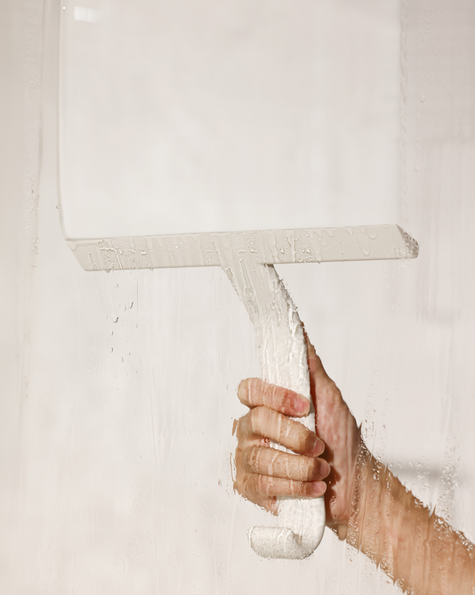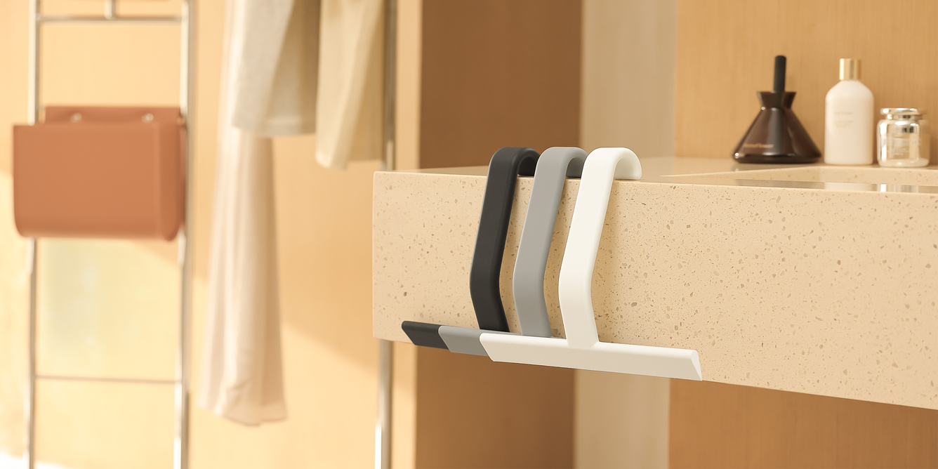 The shower squeegee that hangs itself โ no suction cups, no drilling.