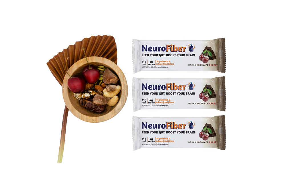 NeuroFiber bars are purposefully designed to deliver brain-healthy omega-3s from walnuts, flax, and chia, potent antioxidants from green tea extract (EGCG), contain vitamins D3, B12, and E, and are clean-label, gluten-free, and vegan.