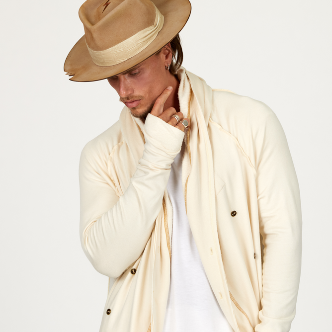 And so he set out to craft his own One Golden Thread fabric blend from the most ethically soft, durable, breathable, biodegradable materials to embue this expression of "comfortable confidence". Emblematic of the global nature of the brand, he blended fibers from European Beech Trees with the top 1% of ethical long staple cotton from California family-owned farms, weaving the One Golden Thread signature fabric that in Jersey feels like silky-skin, and in French Terry, feels like Nature's Cashmere.
