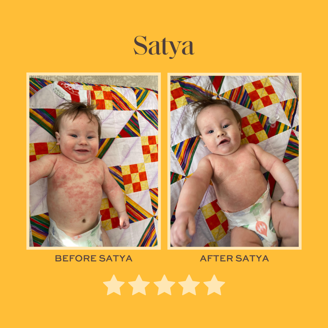 Satya started with a need. Founder, Patrice Mousseau's baby girl, Esme, developed eczema at only 8 months old and was scratching her arms and legs bloody. When brought to the doctor, the only treatment Esme was prescribed was a steroid cream for her delicate skin. Patrice learned from previous experience that topical steroids can have harmful side effects and knew there had to be a better solution. Patrice started looking at what was on the pharmacy shelves — seeking something effective, non-toxic, fragrance-free, and backed by scientifically supported research — and couldn't find a single product that met her needs.