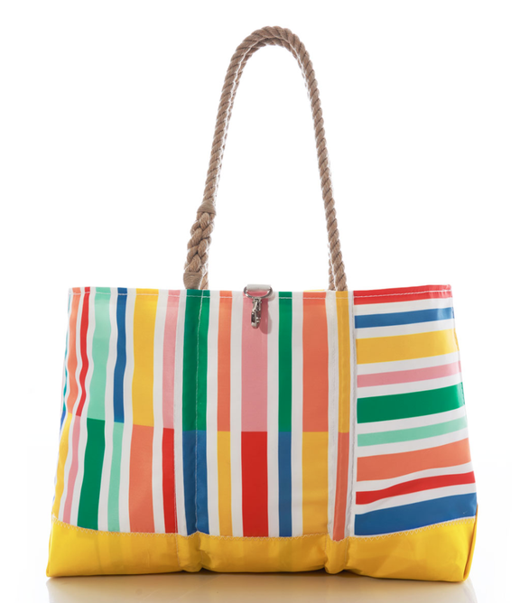 Sea Bags is a brand that specializes in creating bags and accessories handmade from recycled sail cloth. They are known for their durable and high-quality products, such as totes, travel bags, and home goods. Sea Bags is committed to sustainability and supporting causes that align with their values, and all of their products are made in the USA -- specifically on the working waterfront of Maine.